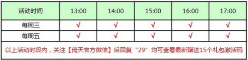系统将在每周三、周五,下午13:00至17:00每个整点时段各放出15个礼包激活码,用完即止。回复“29” 的所有玩家均可获得激活码,但每个激活码只能使用一次,手快有手慢无哦!