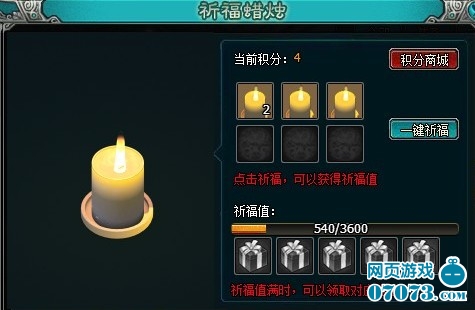 捐献祈福蜡烛获得积分,使用积分可以在商城内的积分商城兑换丰厚的奖励。