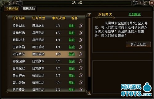 2、活动部分:每天可以获得经验的日常活动包括:斗神战场、天上人间、美女护送、天外神域等活动,记得一定要参加哦;其余经验活动包括猜拳、答题、双倍膜拜,都是可以轻松获得大量经验的日常活动;