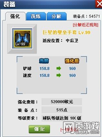 1、新增“装备强化”系统:新增装备强化系统,装备强化将需要消耗装备点与欧元。装备的初始强化等级为0,最高100级。(装备的可强化等级不能超过球队当前等级。)