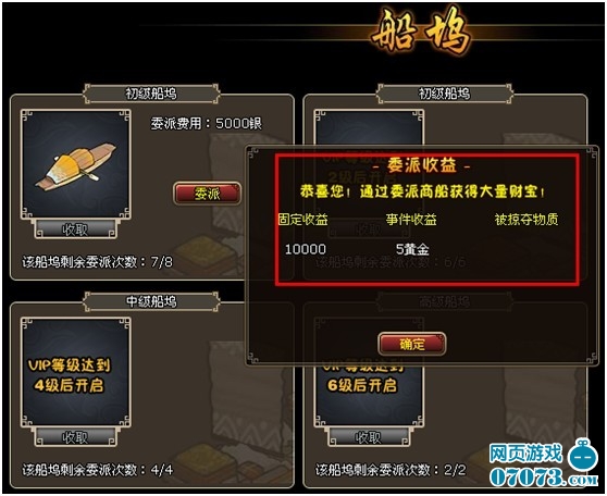 第二:船坞委派商船 商船委派虽然会消耗银两,但是除了固定收入外还有额外奖励的银两 突飞令 血池 黄金 披风,所以实际上是会增加你的银两收入的,这里要注意的是,在自己实力不是很强的时候,请尽量避免在在线人数高峰期委派船只,因为其他玩家可以劫掠你的船只,这样你就会损失银两。