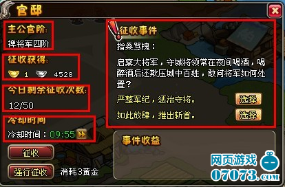 玩家每天的征收次数有限制,最多可累计到50次,征收的银币数量与玩家的官阶等级密切相关,官阶等级越高,每次征收的银币就越多,玩家也可通过强行征收获得银币,强征次数不受限制。