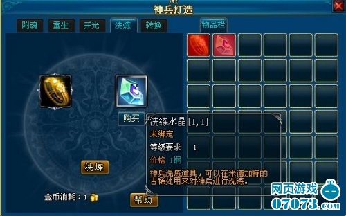 开光之后,如果那个人物技能不是自己想要的,怎么办呢?没关系,除了送人卖商店上论坛骂策划一把甩在任务奖励的NPC脸上让他重新换一个之外,我们还可以洗练。当然这里说的不是让你把2918游戏《英雄王座》神兵里丢到莱茵河洗,那样污染环境的事情咱不干。咱可以在神兵框中放入神兵,通过使用洗练水晶这个道具对神兵进行洗练,完成后,神兵的神兵专属技能等级在1~3级之间随机,神兵所携带的人物技能个数在1~4个之间随机,人物的技能类型在人物所有技能中随机。