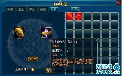上面说的2918游戏《英雄王座》的洗练能够洗属性,还有人物技能,但有时候运气就是这样子是吧。往往中了彩票就会烧了房子,我是说,往往洗出了好属性,人物的技能却不是自己合心的,或者把系统送的商城币——金叶子全买了宝宝,没钱买洗练水晶,那么神兵转换就能够帮到你了。他虽然不能洗属性,但能转换神兵的职业技能。玩家只需在神兵框中放入神兵和技能水晶,然后点击转换按钮即可进行神兵人物技能类型的转换。转换完成后,神兵的人物技能类型将转变成放入的技能水晶所对应的职业的技能类型,成功率也是100%。