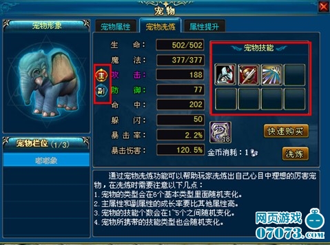 1、 宠物的主、副属性会在6中基本属性(生命、魔法、攻击、防御、命中、闪躲)中随机变化,而主、副属性的成长率要比别的属性高。
