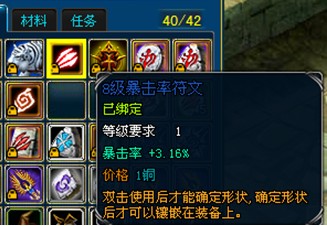 玩家可以从副本掉落、交易或道具商城获得这些远古遗落的符文,符文的种类分为攻击、防御、生命、魔法、躲闪、命中、暴击率和暴击伤害8种,并根据威力大小分为八个等级,其中1-4级的符文称为初等符文,5-8级的符文称为高等符文