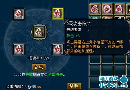 1. 必须使用4个种类相同的符文进行合成,合成成功则获得所用4颗符文最高等级下一个等级的符文。合成时,如果4颗中有绑定的符文,那最终为绑定。若均不绑定,则最终不绑定。