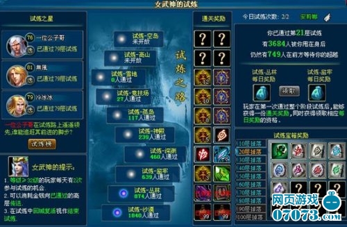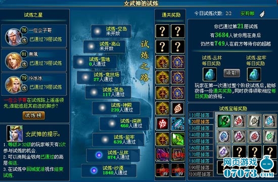 在主城米德加特,32级以上的玩家每天都有2次机会找到NPC试炼指引人安莉娜进入女武神的试炼,只要在每一层规定的时间内,以自己一人之力清除所有怪物即可过关。试炼目前共100层,每10层为一个阶段,共10个阶段。第一次打通完整一个阶段的玩家可获得丰厚的通关奖励,同时获得领取相应每日奖励的资格。