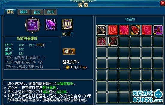强化,可大幅度提升武器或装备的基础属性,而且强化到一定等级的时候,则可以附加额外属性。强化石是强化必备的道具,有初级强化石和高级强化石两种,打怪时掉落的几率很大,也是各种任务奖励中的当红奖品。符文也分为幸运符、神恩符两种,因强化具备一定的失败几率,使用幸运符可提高强化成功率15%,使用神恩符可确保强化失败后装备不会消失,但强化等级降低一级。
