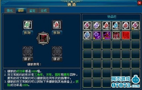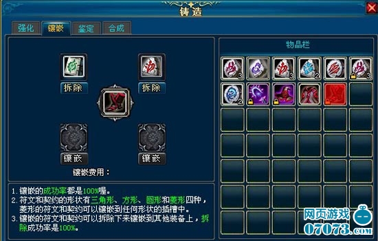 相对于具有危险性的强化,镶嵌则安全多了。只需花费少量的铜钱,就可以百分百成功的镶嵌符文或契约。即使后面想换一个更高级的,也可以完好无缺的拆除下来再次利用。符文和契约是按形状镶嵌的,分为三角形、圆形、方形、菱形四种,可为武器或装备附加生命、攻击、防御、躲闪、命中、暴击、魔法等额外属性。而菱形的符文或契约则不按规矩出牌,可镶嵌到任何形状的插槽中。