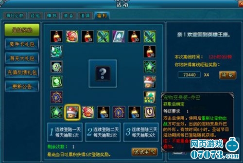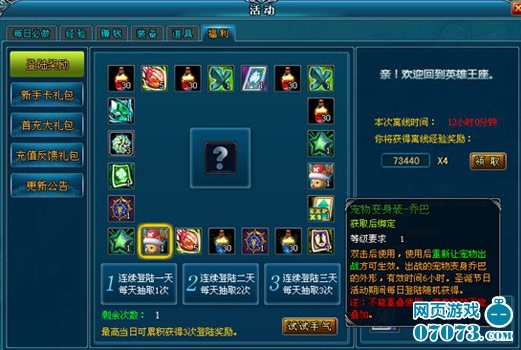 在“蛋”“蛋”活动期间,每日登陆奖励自热更加给力,经常在每天1至3次的幸运大转盘中获得心仪奖励的玩家肯定懂的,而且此次也增加了让人意想不到的道具——宠物变身装。平时总是说宠物是自己左手右臂的玩家们,怎么可以光顾着自己变身忽略了宝宝呢?所以可让当前出战宠物一秒钟变乔巴的超萌宠物变身装火爆出炉啦,玩家们只要连续签到,就有更多机会更大几率获取丰厚奖励哦。