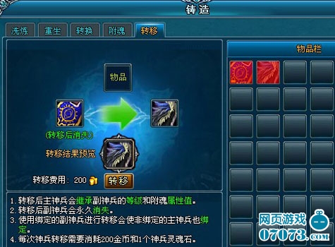 这种类似于“拿来主义”的方式需要首先确定好主、副神兵,主神兵是的即将装备的新神兵,而副神兵是即将被抛弃的旧神兵,而且副神兵的经验与属性必定要高于主神兵,因为转移功能会使主神兵继承副神兵的等级和附魂属性值,转移后副神兵会自动消失。玩家们可在结果预览中看到转移前后的属性对比,如果两者加成相差不多,转移的意义就不是很大。
