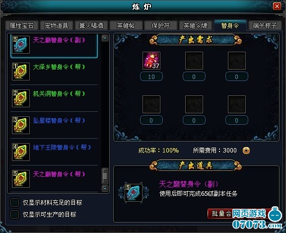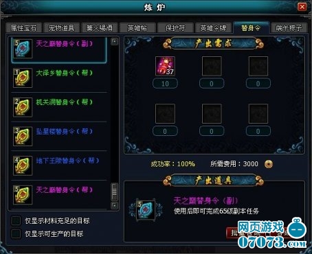 虽然说有点不合英雄之气,但是替身娃娃的出现的确让我们更加轻松自在,也乐得逍遥。在游戏中,收集到一定的替身娃娃,即可以在炼炉中合成相应的替身令,只要使用相应的替身令,即可立即完成相应的副本任务。轻松快速,让那些没有太多时间做任务或者自身实力难以完成副本的玩家找到了全新的发展方式。