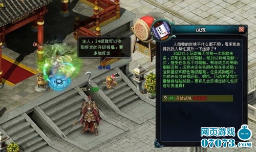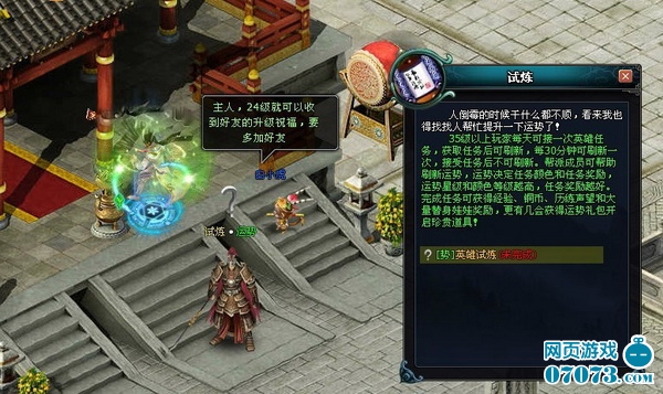 各路英雄儿女,每天都可在武陵城接受一次英雄试炼。英雄试炼可以让帮派成员可帮忙刷新运势,而运势的星级越高,颜色等级则越高,任务奖励会越丰厚,在完成英雄试炼之后可获得经验、铜币、历练声望以及大量替身娃娃奖励。另外还有机会获得珍贵的运势礼包!