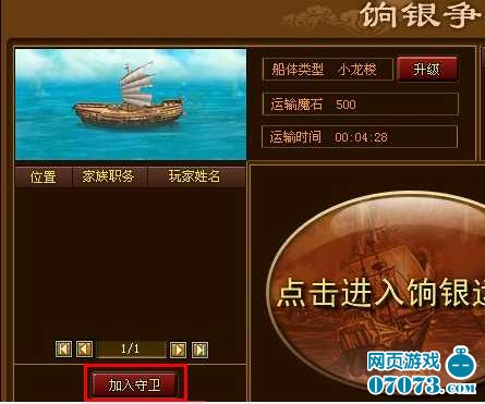 ② 点击“加入守卫”,即可守护本家族饷银船3分钟时间,守护时间达到后,可使本家族饷银船运输时间减少5秒,最多可减少5分钟。