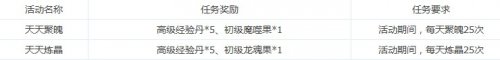 【活动内容】在活动期间内,每日炼晶(聚魄)至少达到25次,可以获得对应礼包一份,(活动分为“天天炼晶”和“天天聚魄”2个,两个活动轮流循环3天)