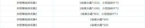 【活动内容】开服第7天,衣柜等级排名前10的玩家能获得礼包奖励(第8天凌晨4点为准,同样等级经验高为准,都一样情况下优先升级的为准)