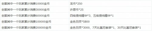 【活动内容】全服某个玩家累计消费达到活动要求,全服贵族玩家可免费领取奖励,伯爵以上玩家可领取所有奖励。(每多一人达到要求,奖励就多领一次)