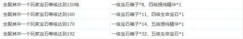 【活动内容】活动时间内,全服玩家镶嵌宝石等级总和达到指定等级,全服贵族玩家即可免费领取。
