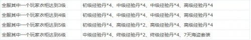 【活动内容】全服某个玩家衣柜等级达到活动要求,全服贵族玩家可免费领取奖励,伯爵以上玩家可领取额度下所有奖励(每多一人达到要求,奖励就可多领一次)