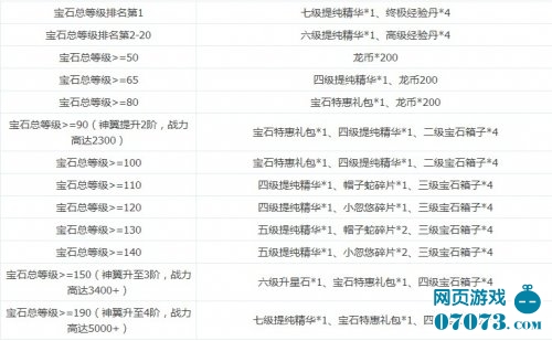 【活动内容】活动期间内,角色装备身上的宝石等级之和满足相应条件即可获得相应礼包奖励。(排名奖励在第3天凌晨4点结算)。