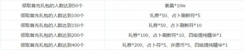 【活动内容】全服领取首充礼包人数达到指定人数,全服贵族玩家即可免费领取巨量奖励。