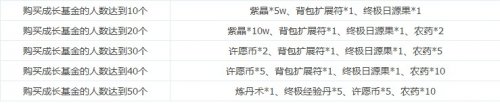 【活动内容】购买成长基金人数达到指定人数(赠送基金也算),全服贵族玩家即可免费领取巨量奖励。