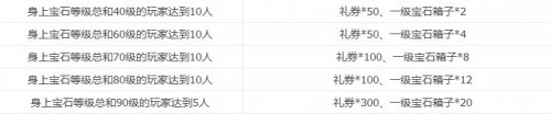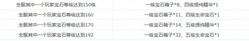 【活动内容】活动时间内,全服玩家镶嵌宝石等级总和达到指定等级,全服贵族玩家即可免费领取。