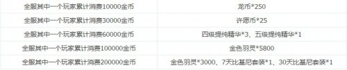 【活动内容】全服某个玩家累计消费达到活动要求,全服贵族玩家可免费领取奖励,伯爵以上玩家可领取所有奖励。(每多一人达到要求,奖励就多领一次)