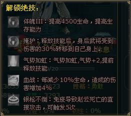 三、武将绝技:这里要注意的是最后一个绝技“银枪不倒”。类似于目前流行的竞技游戏《英雄联盟》里面蛮族之王泰达米尔的大招五秒真男人,还是比较变态的。
