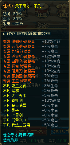 诸葛亮的性格为天下奇才和不凡,在绝技和技能上会回复自己和队友的气势,并且对敌方造成燃烧伤害,是一个强力的后排输出兼辅助,如果配合自身也会涨气势的武将,那百分百回合施放技能将不再是梦想!