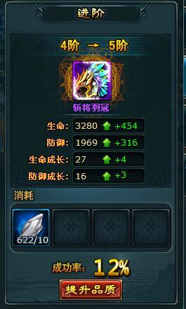 70级头盔4阶升5阶一次需要10个进阶石,成功略为12%。