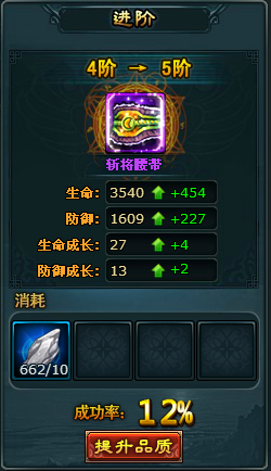 70级腰带4阶升5阶一次需要10个进阶石,成功略为12%。