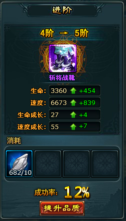 70级鞋子4阶升5阶一次需要10个进阶石,成功略为12%。