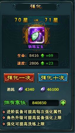 70级玉佩星升1次需要4340寒铁,升10次直接到80星需要46100寒铁。
