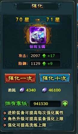70级手镯星升1次需要4340寒铁,升10次直接到80星需要46100寒铁。
