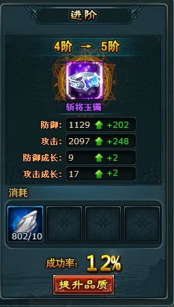 70级手镯4阶升5阶一次需要10个进阶石,成功略为12%。