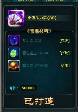 无边法力扇要求2个蓝水晶,240个碧心宝玉,600个耀金锭锻造。