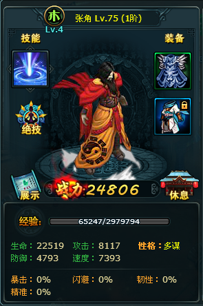 张角性格是多谋,增加30%速度,减少30%防御,适合于后排。相传张角的太平要术会使用妖术,可以操控雷击,所以张角的攻击效果都是雷击,也十分符合绝技中的最后一个技能“天雷”。