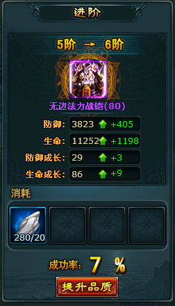 80级衣服5阶升6阶一次需要20个进阶石,成功略为7%。每失败一次成功略增加1%。