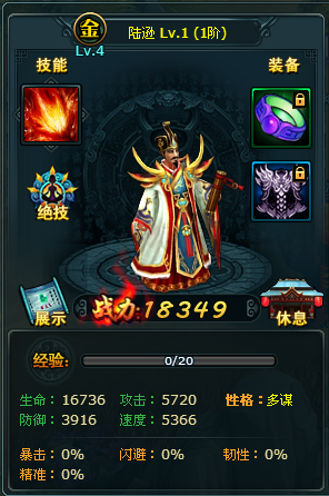 陆逊性格是多谋,增加30%速度,减少30%防御,是一个典型的后排先手法师武将。配合绝技的“谦逊”和“火烧连营”,可在2回合内减少大量受到的伤害并且对敌方造成大量伤害,是个不错的持续高输出的纯输出武将。