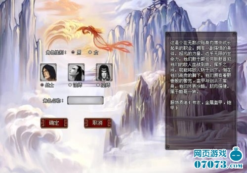 玩家根据自己的喜好选择职业,并填写角色名称,点击确定即可进入游戏(如下图):