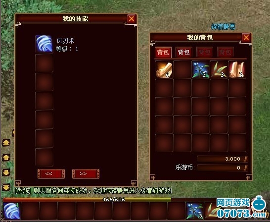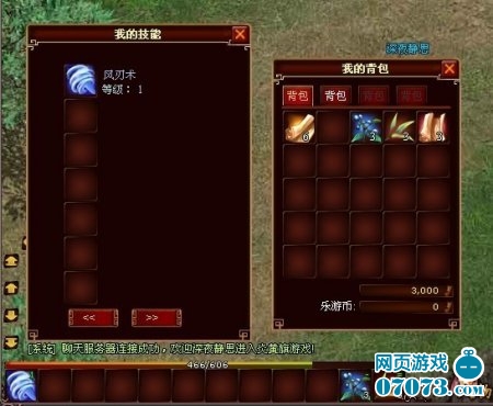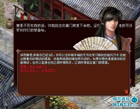 在孙墨那里领导防护装备后,就已经升到3级啦,这时帅哥秋少臣会提醒玩家去学习第一个法师的技能——风刃术(如下图)