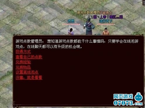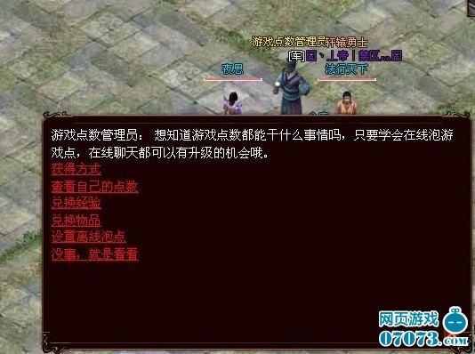 轩辕东城NPC“游戏点数管理员”处可以查看自己的点数(如图4),也可以根据玩家自己的意愿用游戏点来兑换物品或者经验值;点击获得方式,可得知各处泡点的倍数,静养修炼神殿可在东城NPC小乔处进入,但是也需要付出1w的金币。