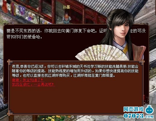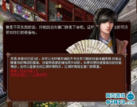 在孙墨那里领导防护装备后,就已经升到3级啦,这时帅哥秋少臣会提醒玩家去学习第一个战士的技能——洗髓易筋啦(如图3)。