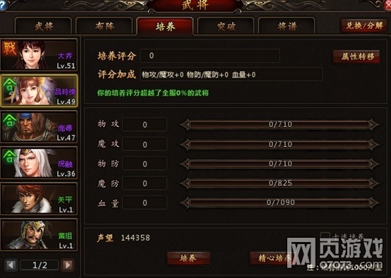 左边一排武将头像是可以选择当前你所拥有的武将进行培养,而培养完成后,系统会给该武将进行培养评分,以此来判断你武将的优秀程度,下方也会有给出评分加成。而右边的属性转移是能够将某个武将的属性以及突破等级转移到另一个武将身上,但是只能转移属性不能转移武将等级,所以各位玩家老爷们要注意啦,如果转移了属性,你所转移的武将还是要从头开始练级的哟~(其实小编觉得如果还转移等级的话会更好些,省去了因为武将等级不足而无法拿出来作为主战将出战的空档期)。再然后下边有个条形卡槽,卡槽满了就表示培养值满了,需要进行突破才能继续往下培养。也就是说每当武将的培养槽满值时,武将必须进行突破才能达到更高的属性,才能继续培养。而培养需要消耗声望值,培养一次消耗1000点。培养可以选择普通培养和精心培养。普通培养是一定几率出现双倍属性的培养加成,而精心培养则是需要消耗20元宝来达到必定出现双倍属性培养加成的效果。