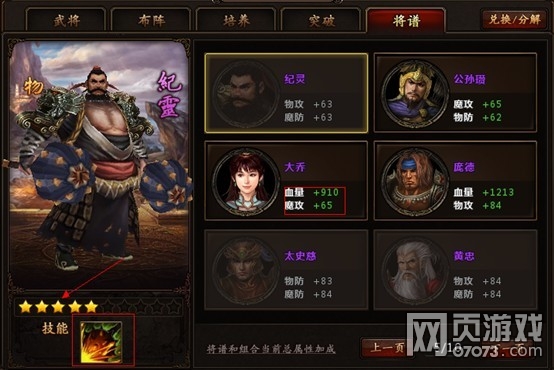 最后一点就是将谱,将谱就有点像宠物小精灵的精灵图鉴一样,也或者说像WOW的战斗怪物图鉴一样。里面有真三乱舞里玩家可以获得的武将信息,信息包括技能信息和武将星级等。除此之外,玩家老爷们在获得新的武将的时候,将谱中相应武将的头像可以激活,然后获得头像旁边的属性加成,如下图: