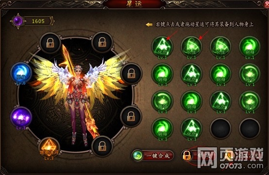 3.合成(可以将任意星运进行合成,合成星运会产生经验值,经验值达到一定程度后星运会升级,升级后的星运属性加成会比原来更高。当然在星运台上只能通过“一键合成”来进行合成操作,在星运仓库里可以通过手动合成,也可以一键合成,后面我会详细介绍)