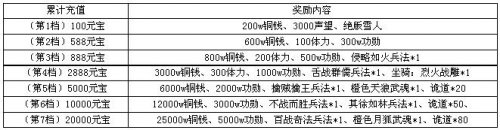 活动内容:活动期间内,玩家在充值达到一定金额,即可领取对应活动奖励内容,超值活动奖励吐血大放送。