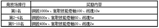 活动奖励:英雄豪杰汇聚一起,在数据互通完毕的前7天中,参加竞技场活动,并在每日竞技场奖励结算时活动前10名的奖励,即可获得额外丰厚奖励内容。